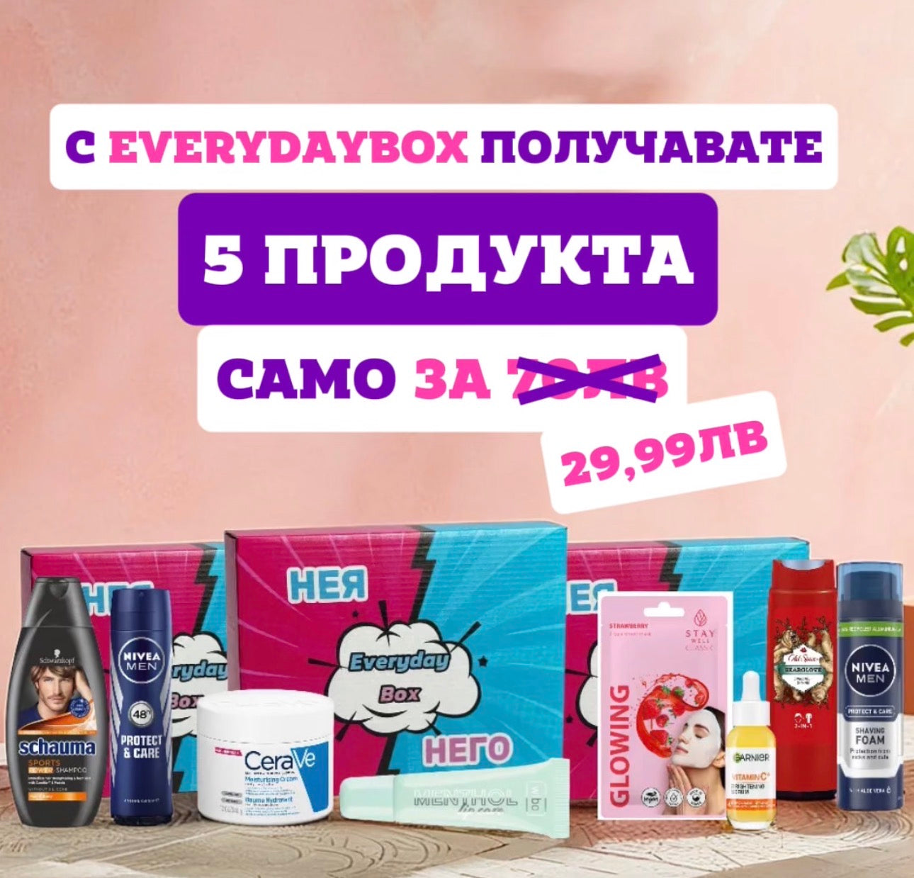 Everydaybox е абонаментна месечна кутия за удобство, която всеки месец ти носи между 4 и 6 козметични продукти. Общата стойност на продуктите винаги надвишава 70 лв, а цената на кутията е 29,99 лв.